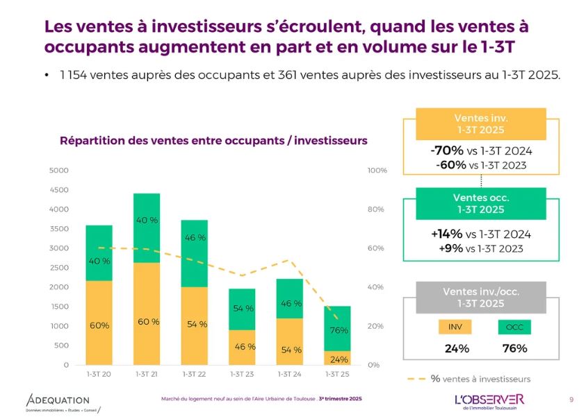 Le recul ne concerne pas que la périphérie — la ville centre, Toulouse intra-muros, subit aussi un fort choc. Sur le 1ᵉʳ–3ᵉ trimestre 2025, la mise en vente y atteint seulement 800 unités, soit une baisse de 28 % par rapport à l’année précédente. Les ventes nettes y chutent également — 740 ventes seulement, en recul de 43 %.